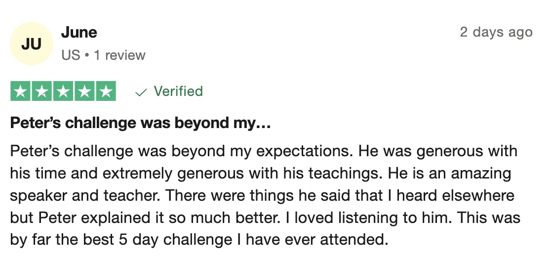 The challenge is 5-days. VIP Session takes place at 11:00am EDT (4pm UK) and the General Session for everyone takes place at 12:00pm EDT (5pm UK).